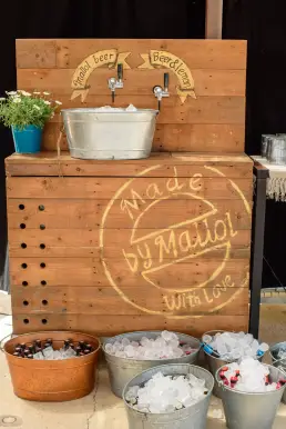 Una ceremonia sencilla, con el mar y las rocas de fondo. Tras terminar, se dirigieron al lounge de madera, decorado con flores y globos de papel de colores, donde les esperaba el aperitivo de Mallol; tirador de Cerveza, barra de limonada, surtido de quesos…