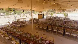 El banquete tuvo lugar debajo de la Haima, las mesas decoradas es estilo sencillo con flores silvestres, que recordaban al campo. Y al lado de la Haima, un espacio con cojines para descansar.